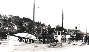 ny havnebassin med kurs mod den ny Auktionshal, kom en rød sidelanterne i
